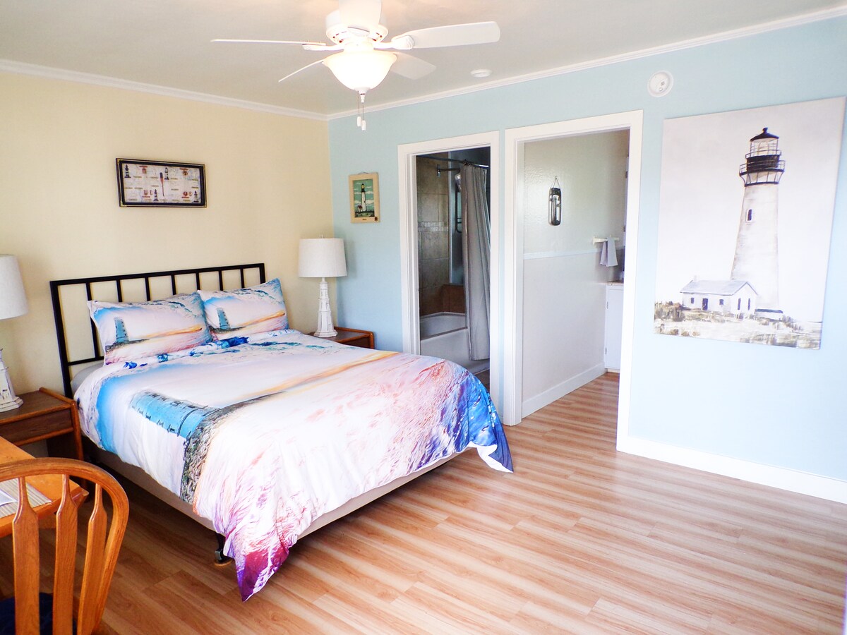 The Lighthouse Room has a 55 inch smart TV that allows you to connect to your favorite streaming services, a fireplace to keep you cozy, dining table for 2 & a queen bed. There is a full kitchen with an oven, microwave, refrigerator, and it comes fully stocked. Included is a tea kettle, coffee maker, plates, bowls, glasses, coffee mugs, silverware, cooking utensils, paper products, pots, pans, pot holders, & kitchen mittens. The bathroom is a bathtub & shower combination. There is a parking space near your unit.