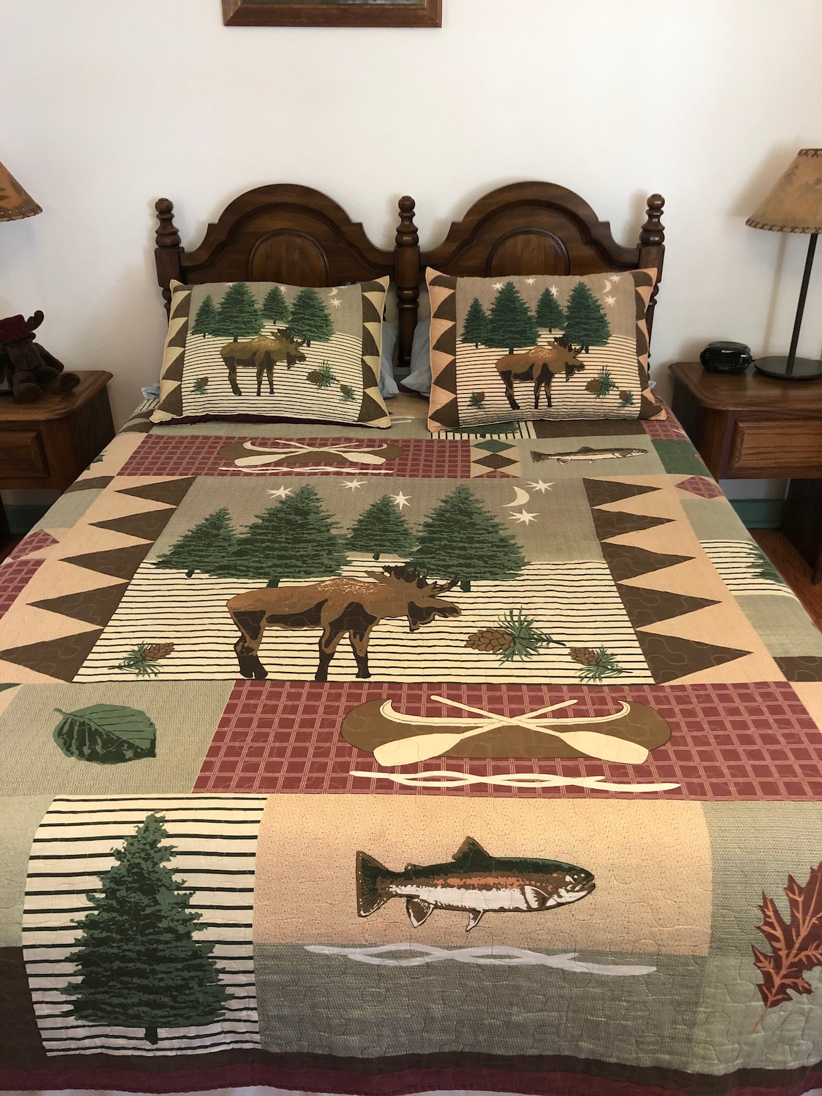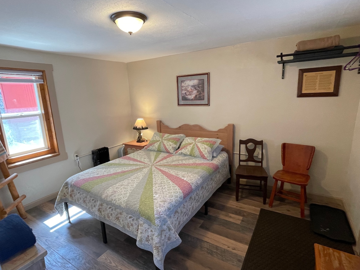 This spacious unit offers a two-room configuration with a modest kitchenette. It is equipped with a gas stove with oven, apartment size fridge, microwave, toaster, coffee maker, pots and pans, coffee mugs, glasses, dinnerware, flatware and cooking utensils. There are 2 bathrooms, queen bed, bunkbed, and Roku TV.