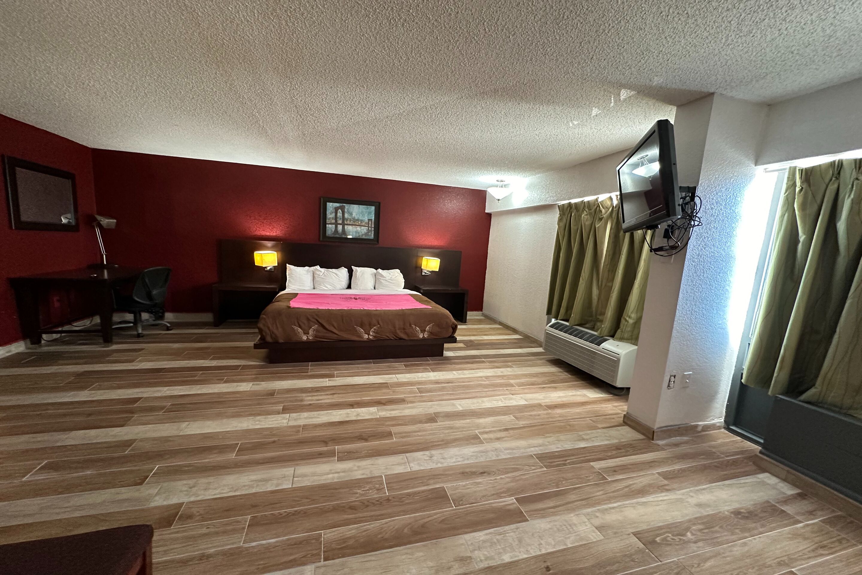 - "It was a great experience!!! No bugs!!! Quiet, clean and surround by restaurants." - "It was nice" - "I arrived with my Emotional Support Animal and they were not sure of the policy but other than than my stay was perfect. " - "I am happy with the stay and price" - "good amenities ant decent price " - "Cozy and clean with good price" - "Nice room and great location." - "Really liked it." - "Overall the space was good for the price and location, just some small things I wish was where better This was my first hotel I have booked myself, it was simple and the front desk people were nice and helpful. The room was mostly clean, inside the trash cans were dirty and needed a desperate scrub. There was also something on the floor near the bed and something melted onto the dresser infront of the tv. There was a bottle cap in a dresser drawer. The bed was okay but the pillows are hard and the toilet paper was rough and thin. The shower head is fixed to the wall, presser was okay but it was on blast mode and had to figure out how to change it to be more gentle. Temperature in the shower was also good. One lamp by the bed had no bulb and was loose fitting. It was nice and quiet and a good amount of space"
