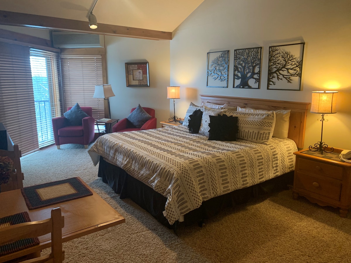 Studio Room located next to the Galena Territory. King Bed, Indoor Pool, fitness center, Hot tub, Gas Grills, 6 miles from downtown Galena. Chestnut is approx 14 miles away.