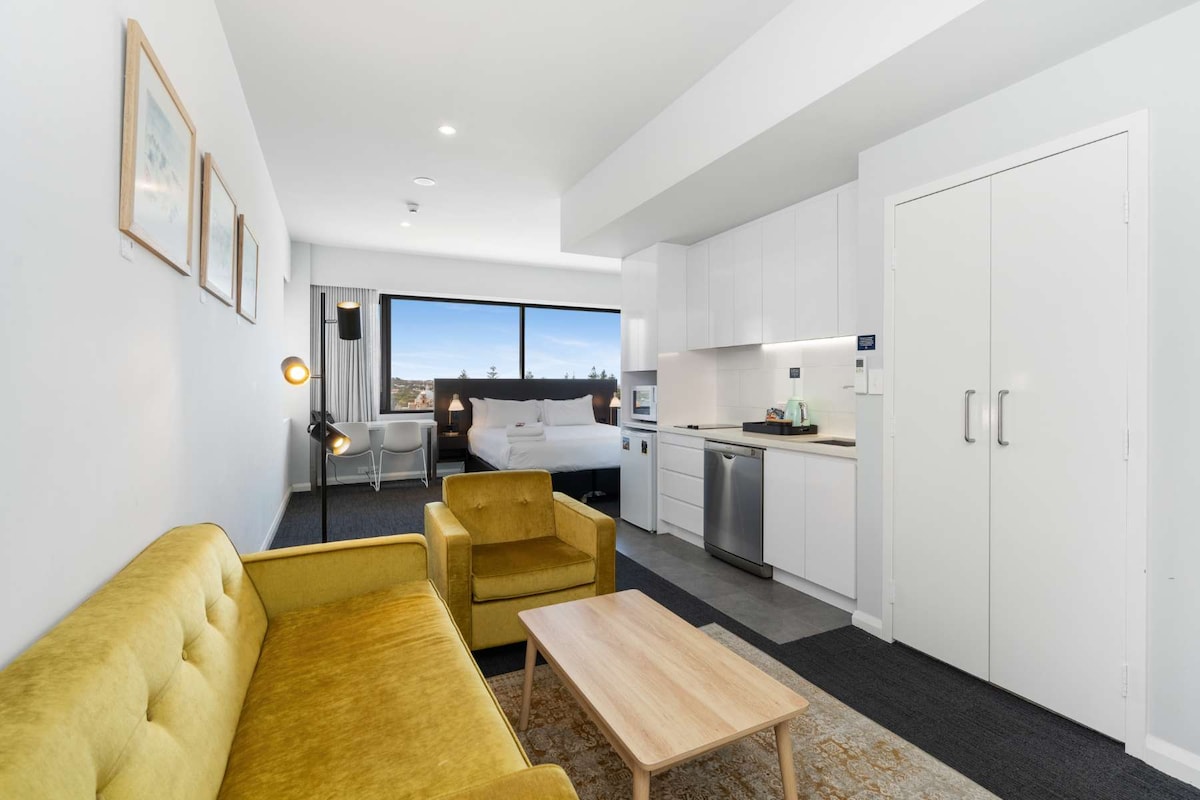 At 42 square metres, the king apartments have a king size bed and are fitted with a kitchenette, which has a dishwasher, microwave and stovetop. This magnificent apartment has been custom-designed with a focus on luxury and style. This is the perfect apartment for extended stays, given the extra space it provides. Features include mini-bar, super-fast WiFi, and a phone for making local phone calls. Each room is equipped with a high definition flat-screen TV, tea and coffee making facilities, a writing desk with power hub recharging stations, iron & ironing board and plenty of cupboard space.