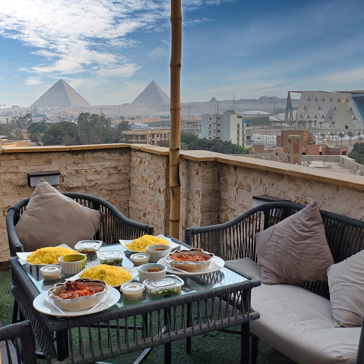 - "The hotel staff were incredibly welcoming and attentive, ensuring every need was met with a smile. The room was spacious, clean, and beautifully decorated, offering both comfort and a sense of luxury. I particularly appreciated the small touches, like fresh linens, complimentary refreshments, and the cozy sitting area perfectly positioned to take in the majestic views. Dining at the hotel was also a fantastic experience. Whether it was breakfast on the terrace with the pyramids in the background or a delicious dinner at the in-house restaurant, the food was fresh, flavorful, and authentic. The hotel's location is perfect for exploring the pyramids and surrounding attractions, yet it still offers a peaceful and relaxing retreat after a day of sightseeing. Overall, my stay at Pyramids sunshine view was nothing short of magical. If you're looking for a unique and unforgettable experience with the best views of the pyramids, I highly recommend this hotel. I'll definitely be returning!"