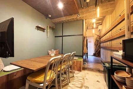 The dining space with a cute lawn-style bench seat can comfortably accommodate up to 8 people.The wall-mounted smart TV is compatible with video distribution services such as Netflix, so you can enjoy movies and music.With the HDMI connection, you can stream video from your own video equipment, which can be used for meetings and presentations.
