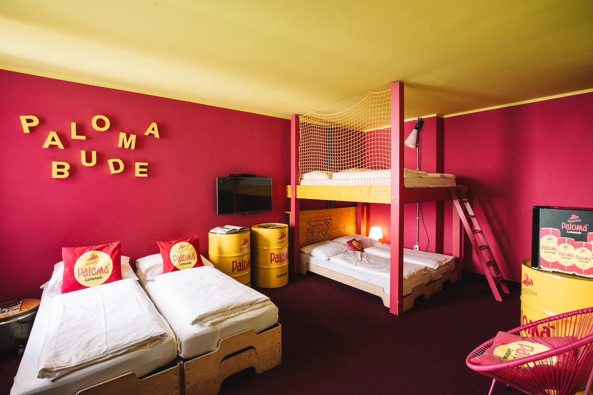 The Palomabude, a complete, pink-yellow sleeping experience for six of you! Colorfulness in sometimes very grey Hamburg. Among other things, there is a double loft bed that reminds you of childhood, a walk-in closet, relaxed fatboys to linger comfortably, a block rocker for the right sound, Internet TV and one or the other surprise.