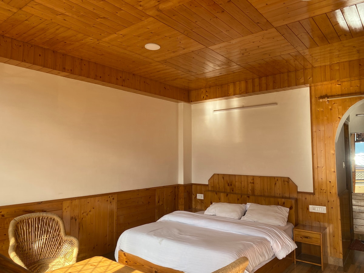 It is a Room of Resort with a 360 degree Private Balcony. Located in a very decent location surrounded with apple orchard and scenic view of snow mountains from balcony and room. A garden with bonfire available for the night entertainment. Definitely it is place for joy silence and luxury.