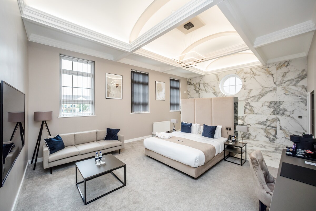 Our King rooms are amazing airy spaces, which are tastefully decorated and cater for everyday life. The room boasts a SuperKing bed supplied by the Chelsea Bed Co for maximum comfort. The room is furnished with a 43 inch smart TV with Netlfix and Youtube. The room is also equipped with a minibar fridge, tea & coffee facilities and a telephone. The en-suite bathrooms are equipped with a power shower, basin, WC and our hand selected toiletries by Molton Brown.