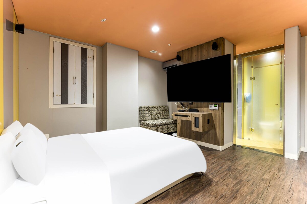 Perfect for 1–2 guests. Enjoy full privacy with your own bed, A/C, fridge, TV, and Wi-Fi.