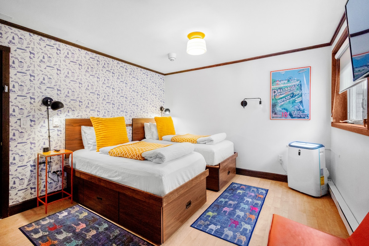 This corner room is located on the third floor with views of the surrounding neighborhood and a peak at Mount Jumbo, this room is perfect for a family of four. It features a King bed with European-style bedding and under-bed storage as well as two lounge chairs that each convert into a twin mattress. The bathroom has a deep soaking tub and shower combo and well-lit vanity area. The room has a storage bench, desk area, smart TV, and light-blocking curtains.