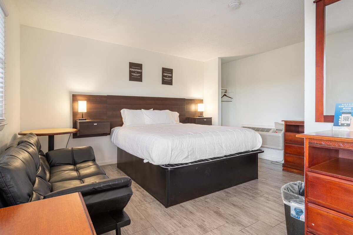 - "rooms have been cleaned up new staff and stepped up security " - "very convenient for options to go out" - "It was as expected for a last minute place. The location was not nice. The other guests were loud and there was a lot of trash outside. There is a liquor store attached to the premises." - "I always enjoy my stay no matter what" - "Good" - "Room was okay for guest. I booked room for homeless Army veteran. " - "Convenient,quiet sleeping, continued hot water for bathing/showering; good quality air in room."