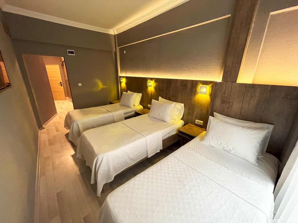 In the middle of the city, next to Vakıfbank, there are toilets and bathrooms in all rooms, we take the bikes and engines of our guests who travel by motorcycle and bicycle to a safe room inside, you can use them with peace of mind, our valued customers, I kindly request you to book without too high expectations. After all, this is not a 5 star hotel, we will work for you to have a good economic time ☺️