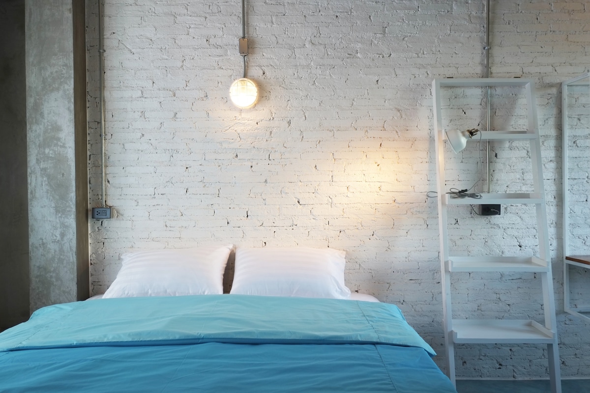 Deluxe room with Aircon come with bathroom attached at Chanchalay decorated in tasteful mediterranean blues and whites style with white-pebble.