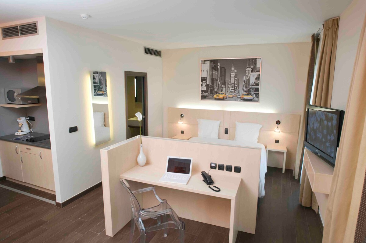 There are many restaurants and bars in the direct neighborhood and you can reach the Central Station in 4 minutes on foot. The hotel is 150 meters from a large center offering water sports activities and wellness services for adults and children. An automatic coffee machine is available at the reception.