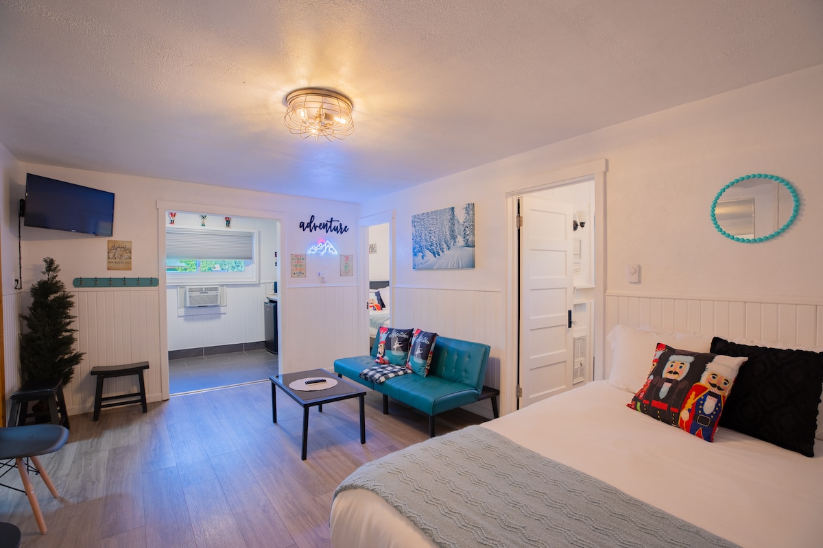 Enjoy this newly renovated Christmas Themed room with everything brand new. Just steps away from eating, shopping & festivities.