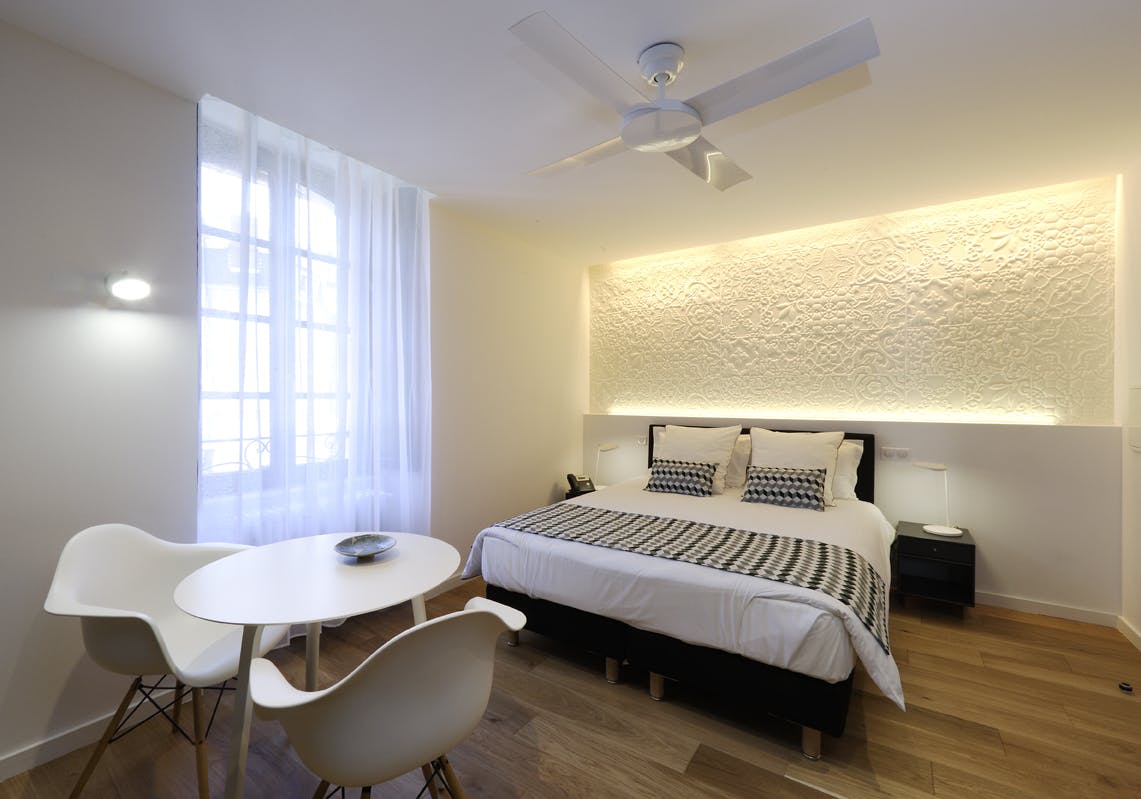 Studio room No. 1 located on the first floor by the Creuse river. It is decorated in a contemporary style and furnished with designer furniture. The floor is oak parquet. It includes a kitchenette (fully equipped with a dishwasher, oven, fridge, dishes, etc. ), a NESPRESSO machine, a storage wardrobe, a desk, a dining table, and 2 armchairs, a double bed (160 cm), and a 32-inch smart TV that also allows you to listen to the radio.