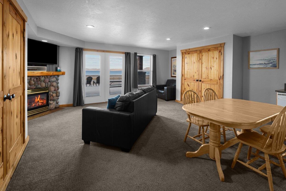 Our comfortable superior suite at our beach hotel. These suites provide a gorgeous lake view and have one bedroom with one queen bed, plus two murphy beds in the living room to accommodate up to 6 guests. They come with furnishings, a private bathroom, gas fireplace, heat and air conditioning, cable TV, and WiFi access. The kitchen includes full appliances, sink, microwave, dishwasher, and coffee maker. There is also a large patio overlooking the picturesque. Linens and towels are provided.
