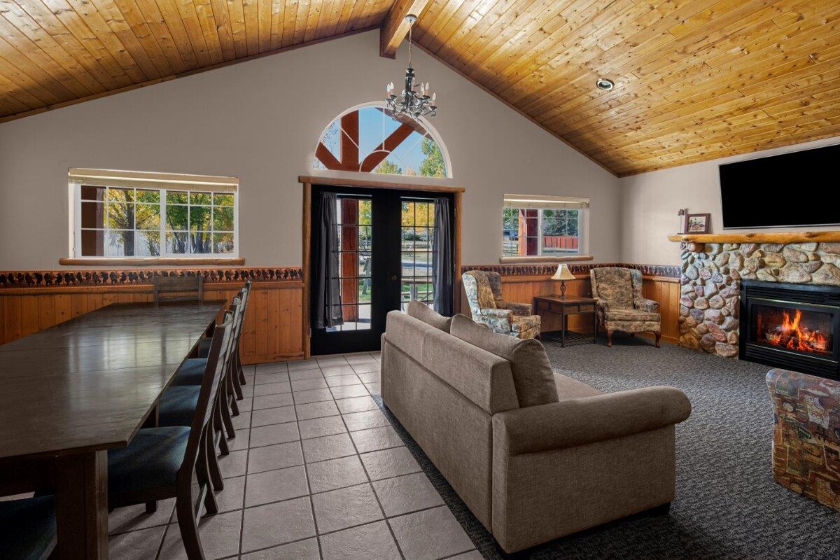 Enjoy your stay with us in one of our spacious family suite rentals at our park hotel. They include one sleeper sofa and two queen beds to accommodate up to 6 guests. Each unit comes furnished and provides a private bathroom, central heat and air conditioning, 60-inch cable TV, WiFi access, and gas fireplace. The dining room and kitchen area that provides full appliances, microwave and coffee maker. Linens and towels are provided.