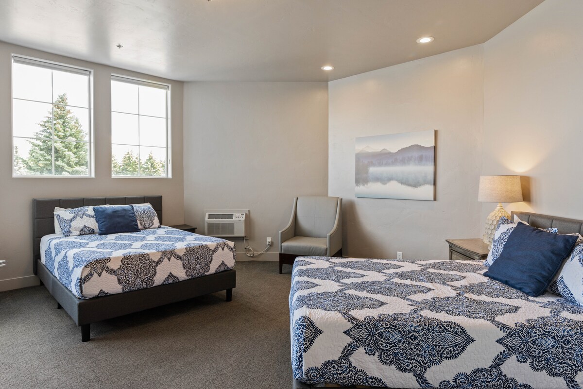 This standard hotel room is wheelchair accessible and offers a comfortable stay at our park hotel. It provides wider doorways and two queen beds to accommodate up to 4 guests. Additional features include a flat screen cable TV above an electric fireplace, heat and air conditioning, WiFi access, and an accessible bathroom with grab bars. There is also dining table and wheelchair accessible kitchenette with a mini refrigerator and microwave. Linens and towels are provided.