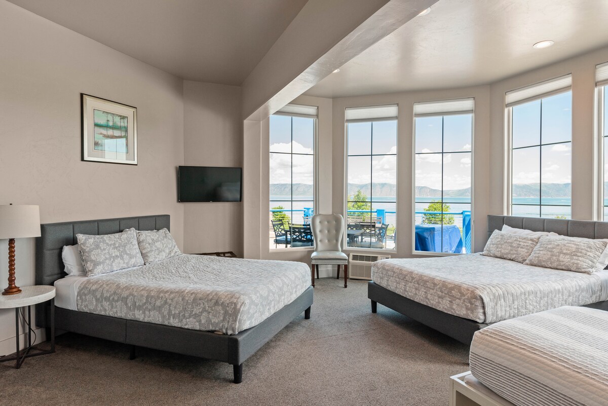 Treat yourself to a comfortable superior suite at our beach hotel. These suites provide a gorgeous lake view and have one bedroom with two queen beds, plus two murphy beds in the living room to accommodate up to 8 guests. They come with furnishings, a private bathroom, gas fireplace, heat and A/C, cable TV, and WiFi. The kitchen includes full appliances, sink, microwave, dishwasher, and coffee maker. There is also a large patio overlooking the picturesque lake. Linens and towels are provided.