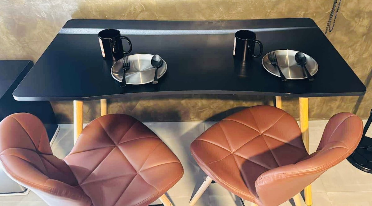 2 floors 1 Living room with 42inch tv, kitchen, bathroom couch, dinning and office table/chairs. 1bedroom with 36inch tv with Netflix, double sized bed, mirrors, bathroom dinning and office table, hangers and closet. Building is equipped with high speed Internet (pls check photo)