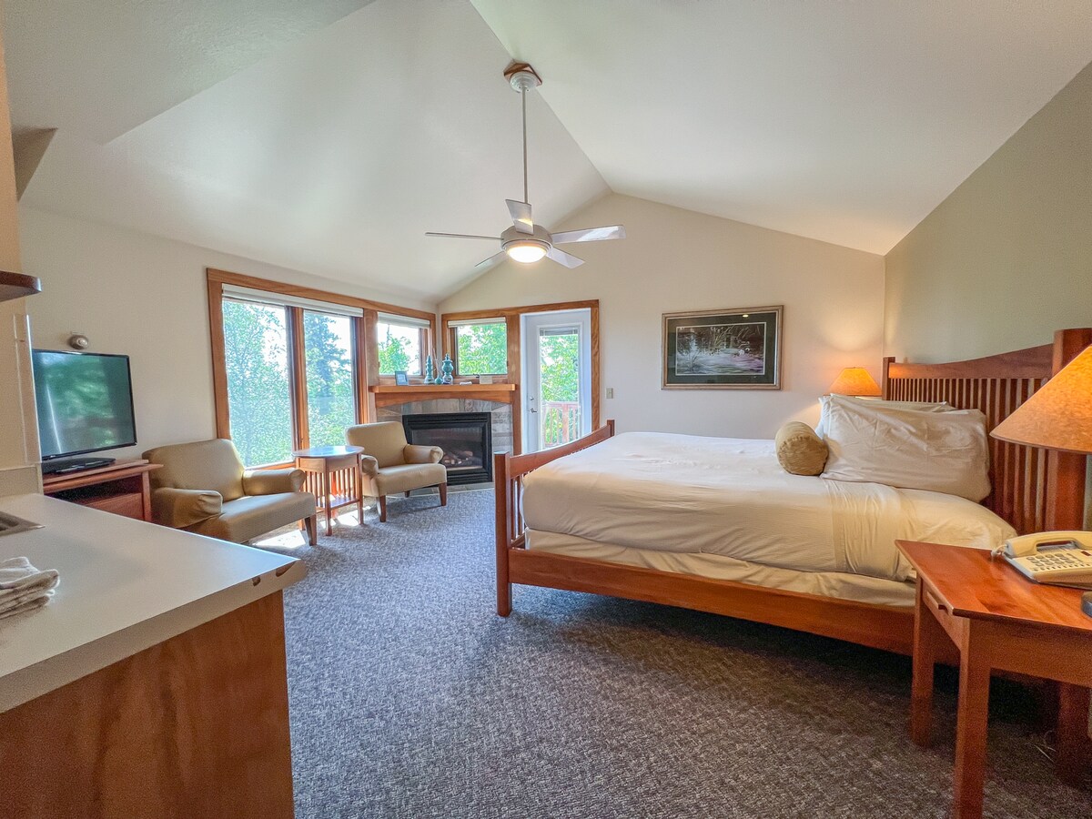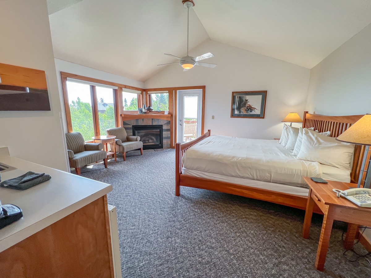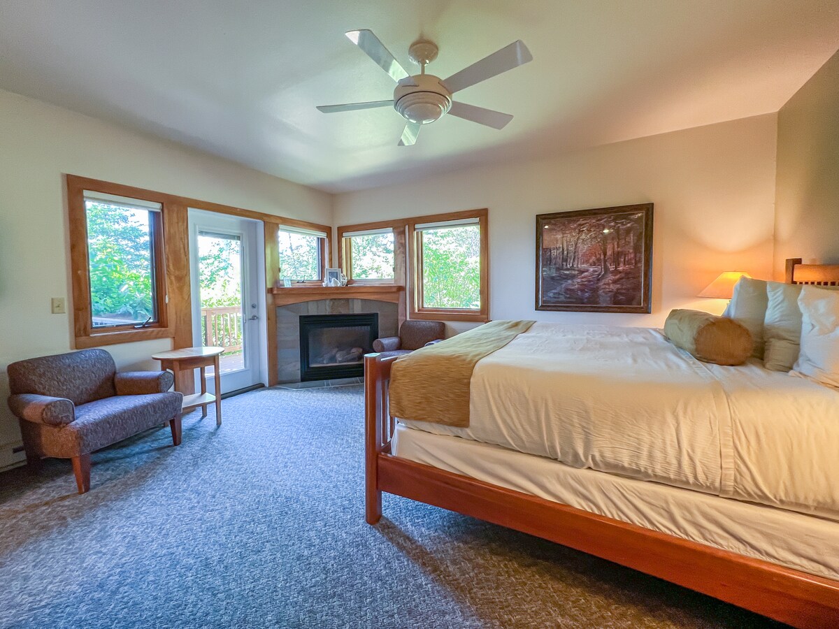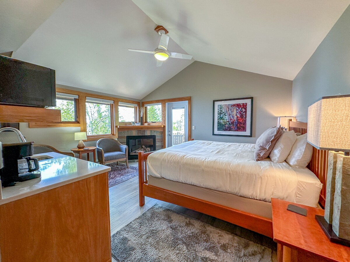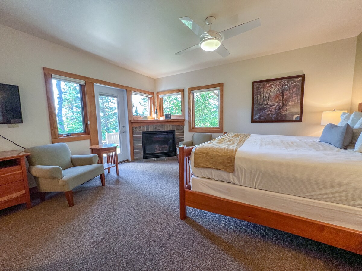 Poplar River Condo 564 Riverside King Guestroom features a king-sized bed, a wet bar, a gas fireplace, a lake-facing deck, and a private bathroom with a jetted tub and stand-alone shower. This unit is located along the Poplar River with peek-a-boo views of Lake Superior.