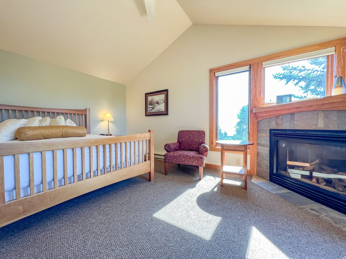 Poplar River Condo 561 Upper Lakeview King Guestroom features a king-sized bed, a wet bar, a gas fireplace, a lake-facing deck, and a private bathroom with a jetted tub and shower combination. This unit is located along the Poplar River with views of the river and peek-a-boo views of Lake Superior from the river-facing deck.