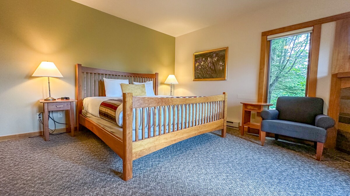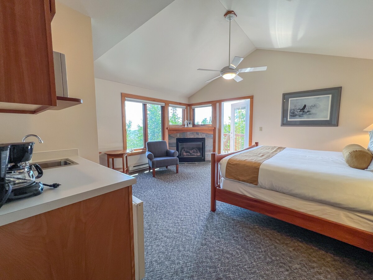 Poplar River Condo 624 Ridgeline King Guestroom is an accessible hotel-style room featuring a king-sized bed, a wet bar, a gas fireplace, a lake-facing deck, and a private bathroom with a jetted tub with support bars plus a separate shower with a bench. This unit is located on a ridgeline above Lake Superior. From the deck, you can enjoy views of the broad wooded property and peek-a-boo views of Lake Superior.