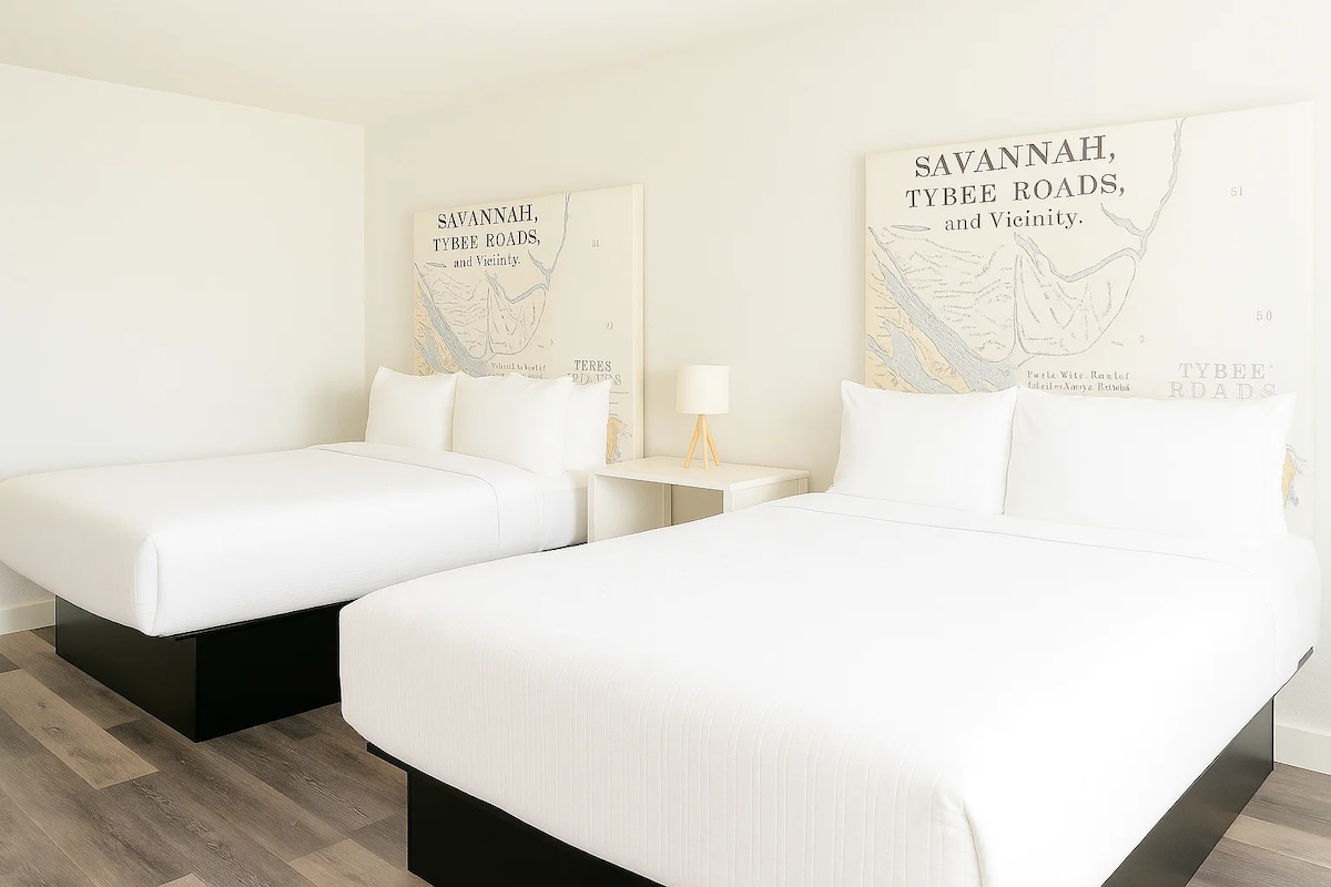 Enjoy a fresh, minimalist design that brings together comfort, functionality, and style. Each room features two queen-size beds with premium linens, soft lighting, and a unique custom headboard that adds a modern touch.