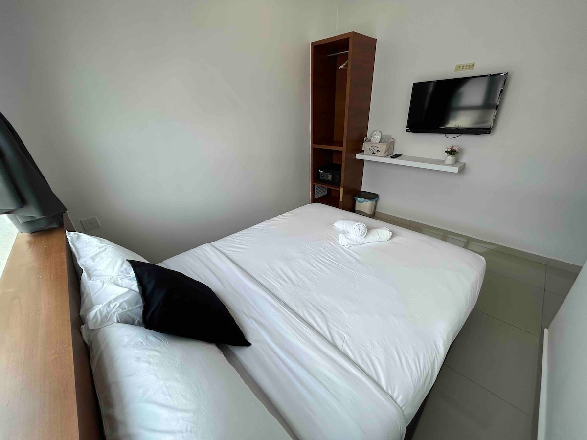 This hotel room comes with 1 Queen Bed, air-conditioning and has a private attached bathroom with hot shower. It can comfortably fit up to 2 guests, suitable for couples and friends. This room may be prone to noise as we are located beside a road junction, there is also a club behind our hotel. Please do not book if you are a light sleeper.