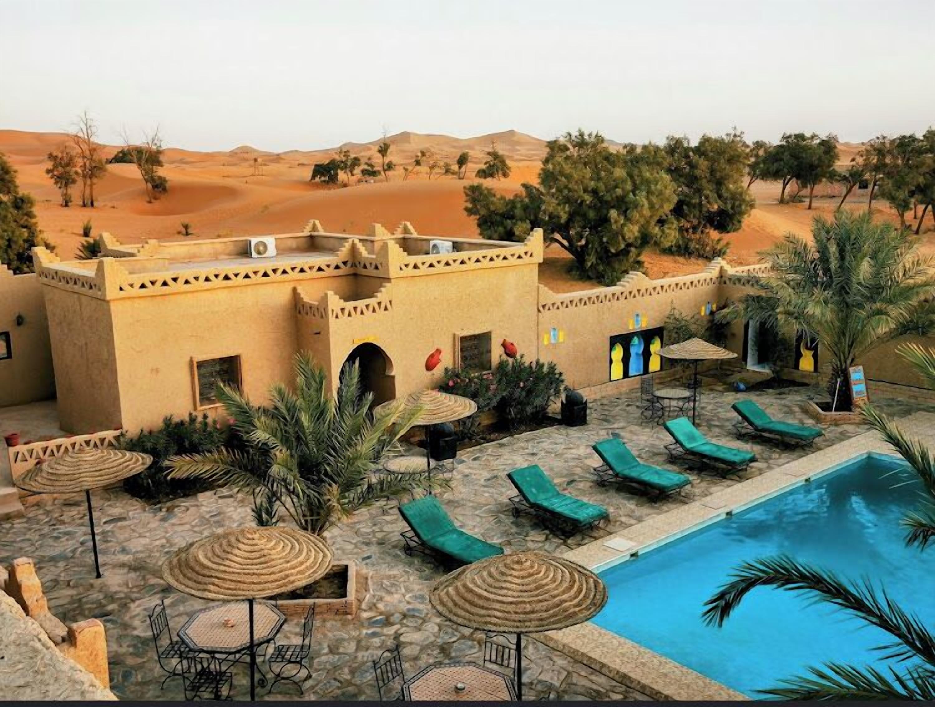 hotel & riad Merzouga is a traditional guest house located in the village of Merzouga, Morocco at the edge of the Sahara desert. the riad is situated in close proximity to the towering sand dunes of erg chebbi, which are some of the largest sand dunes in the world.