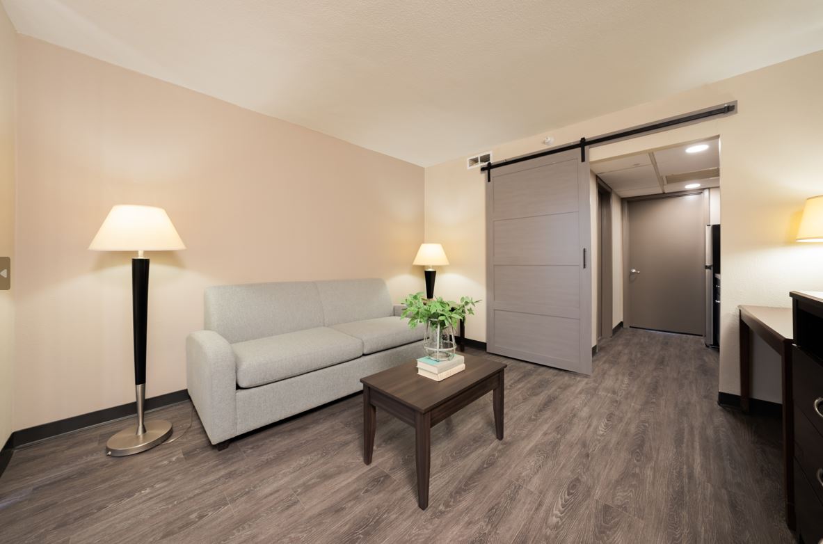 We invite you to experience a tranquil oasis amidst the vibrant energy of Mesa, nestled within a retro-chic 1980s building. Our 78 newly semi-renovated, fully furnished one-bedroom King Suites, feature our kitchenettes with spacious refrigerator, perfect for storing your favorite snacks and beverages, while offering the flexibility to prepare light meals. Our inviting living room area with a queen-size sofa sleeper provides additional sleeping space, accommodating up to four people comfortably.