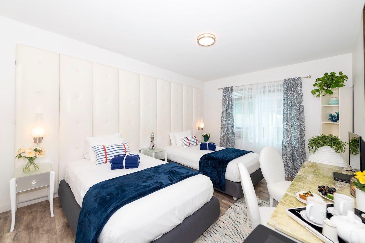 The Alamac places you right in the heart of South Beach—just one block from Ocean Drive and the beach. Whether you're sunbathing on the sand or exploring the area's parks, museums, bars, and restaurants, everything you need is within easy walking distance. Inside, each unit is thoughtfully designed with a fully equipped kitchen, comfortable living spaces, and in-unit laundry for added convenience. After a day out, relax by the outdoor pool or unwind in the cozy, modern interiors.