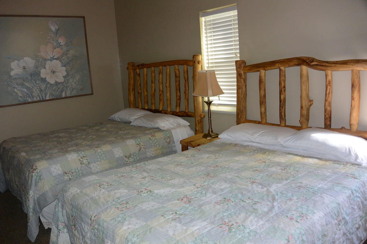 The Shady Lady is inside our charming rustic hotel. Two queen with a private bathroom with bathtub. Private deck overlooking the front of the hotel.