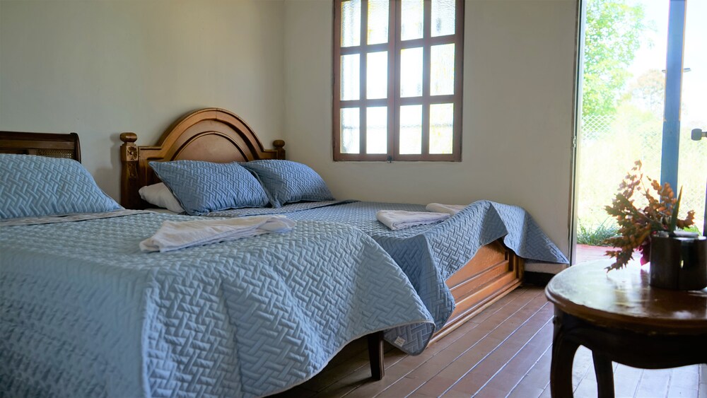 It is a typical construction accommodation of the region, located in the municipality of Montenegro - Quindío, 5 minutes from Parque del Café. The hotel has 8 rooms with an ensuite bathroom. It has a pool, kiosk with social bathroom, BBQ, ping pong table, board games, frog game, wifi, TV in the main room, parking lot, green areas, playground, volleyball court & micro football and is located with fruit trees. We provide personalized service and want to make a difference.