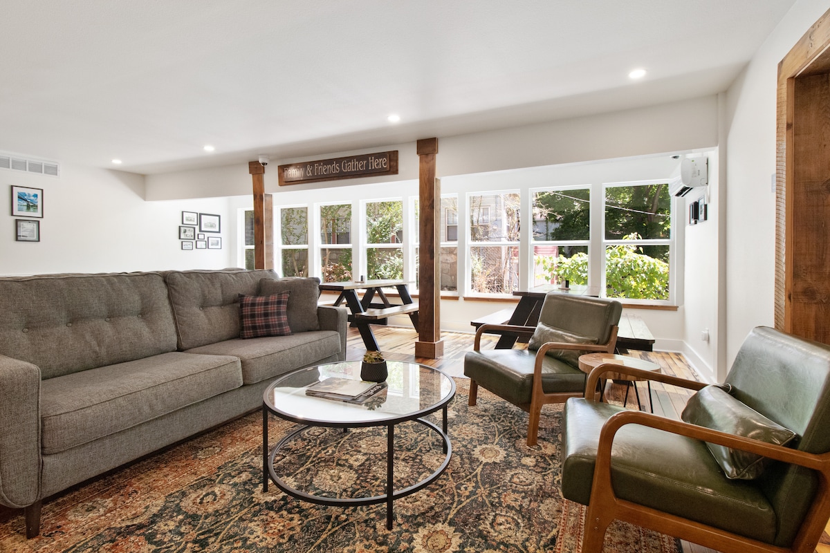 Front enclosed interior porch sitting area, large shared common lounge area with tables, couches & chairs, back seating area, firepit area in rear of the building.
