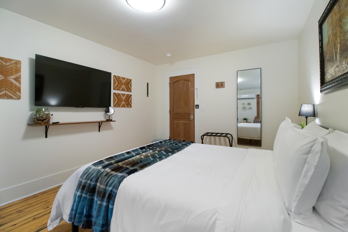 The "Commercial Hotel" has 12 private bedrooms that can each be reserved separately with 4 rooms including private bathrooms (101, 102, 103, & 201). There are 3 additional full bathrooms upstairs to be shared between the other private bedrooms. Two additional half bathrooms are downstairs in the shared lounge area. The bathrooms and common areas are cleaned daily by our team to ensure everyone has a great experience.