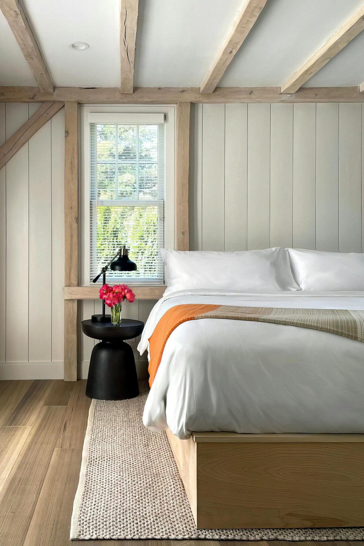 This cozy room is reminiscent of a ship's cabin or a botanist's cottage and is made all the more charming by a window-facing writing desk and unique sloped ceiling. This room has access to a private bathroom in very close hallway proximity, plus Le Labo bath amenities, Revival New York linens, and a Marshall speaker.
