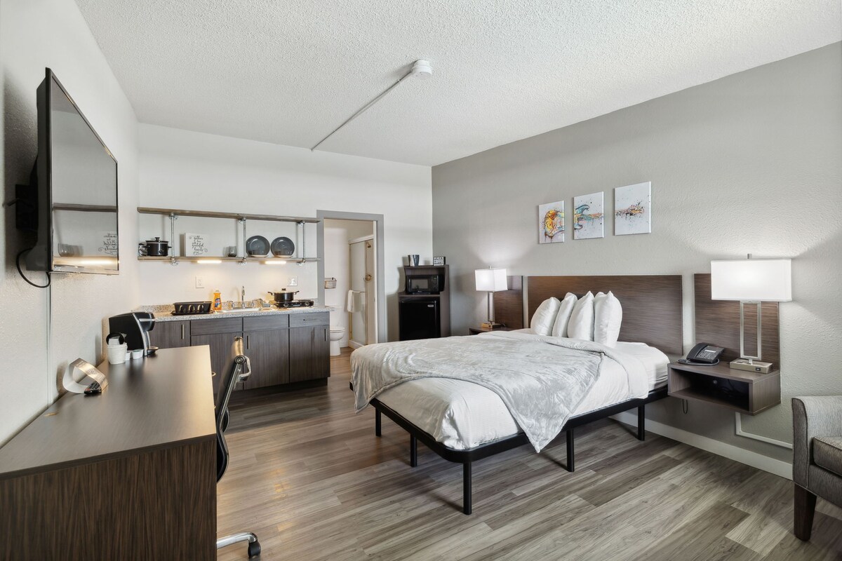 At 250 sq ft, Classic Queen 314 features a custom-made, queen bed and a full bathroom with double sinks!