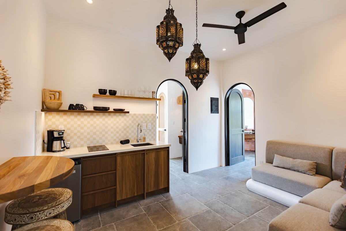The 2 Bedroom Queen Suites are located on the first floor of Domo Hotel. Enjoy the grand entrance as you follow the eclectic tiled floor to your suite. The 2 Bedroom Queen Suite experience begins with the beautiful arched door, hand crafted here in Costa Rica. As you enter the unit, you are welcomed with the warmth of light and designer finishes.