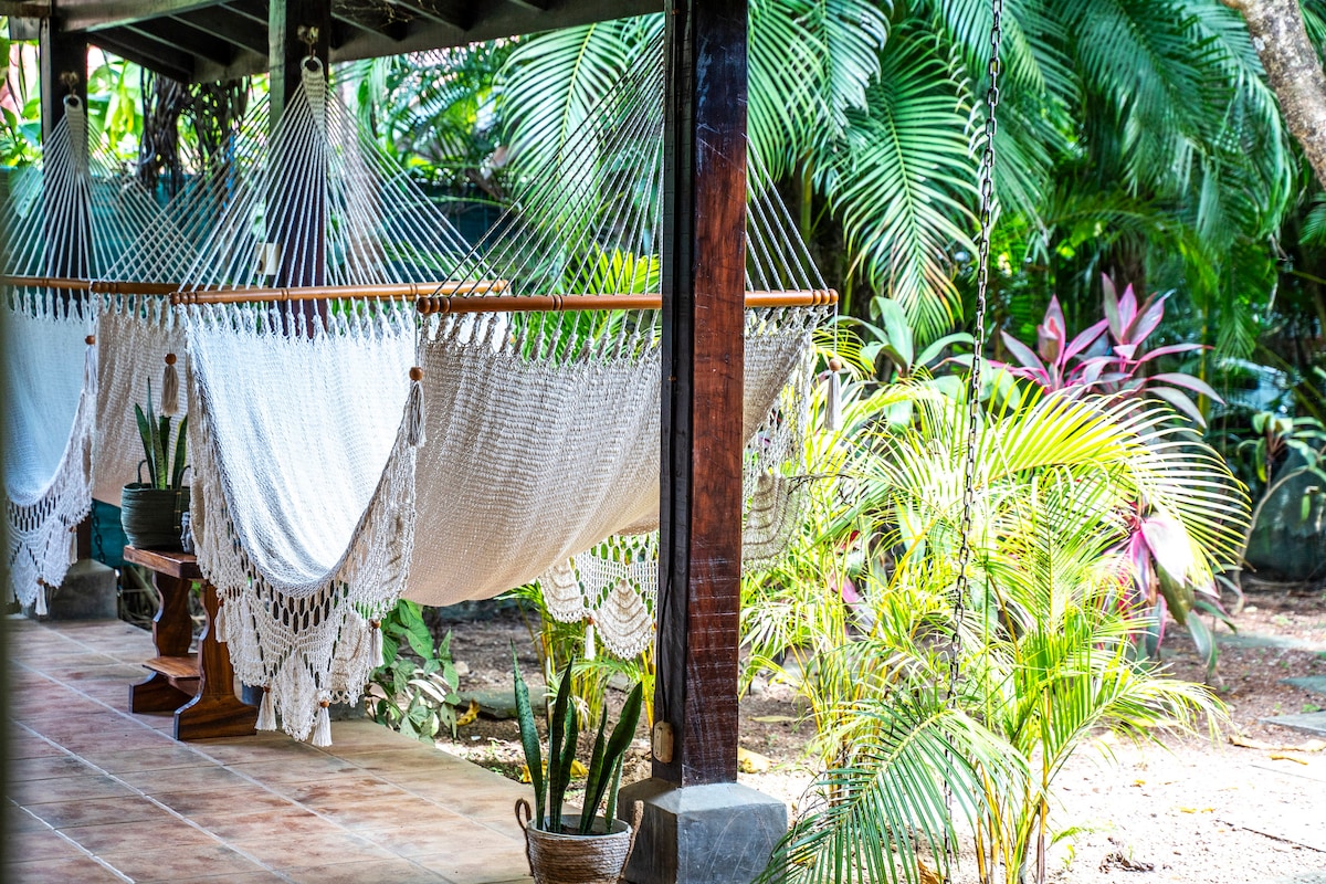 My place is a beautiful Rancho with a lounge common space, a little yoga studio, and a big pool. Rooms surround the main Rancho along with a lush garden and hammocks. There is a delicious Juice Bar & Cafe (closed from Oct 17th until Oct 31st, 2022). Five minutes walking to the beach and across the street from an awesome little grocery store, Italian gelato, pizza slice, and ten more dining options. Best location in Playa Guiones.