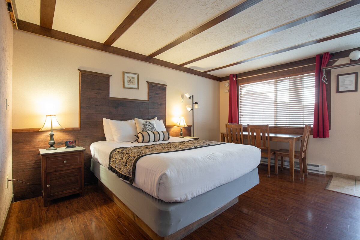 This studio style, dog-free unit offers everything for you need for relaxing at the beach. Easy access to the outdoor pool and back lawn – you’ll find yourself sitting on the deck enjoying the sights and sounds of being on beach time! With its king bed, kitchenette and gas fireplace – the only thing missing is you! If you need more room, this unit connects to #112 for a perfect family retreat spot.