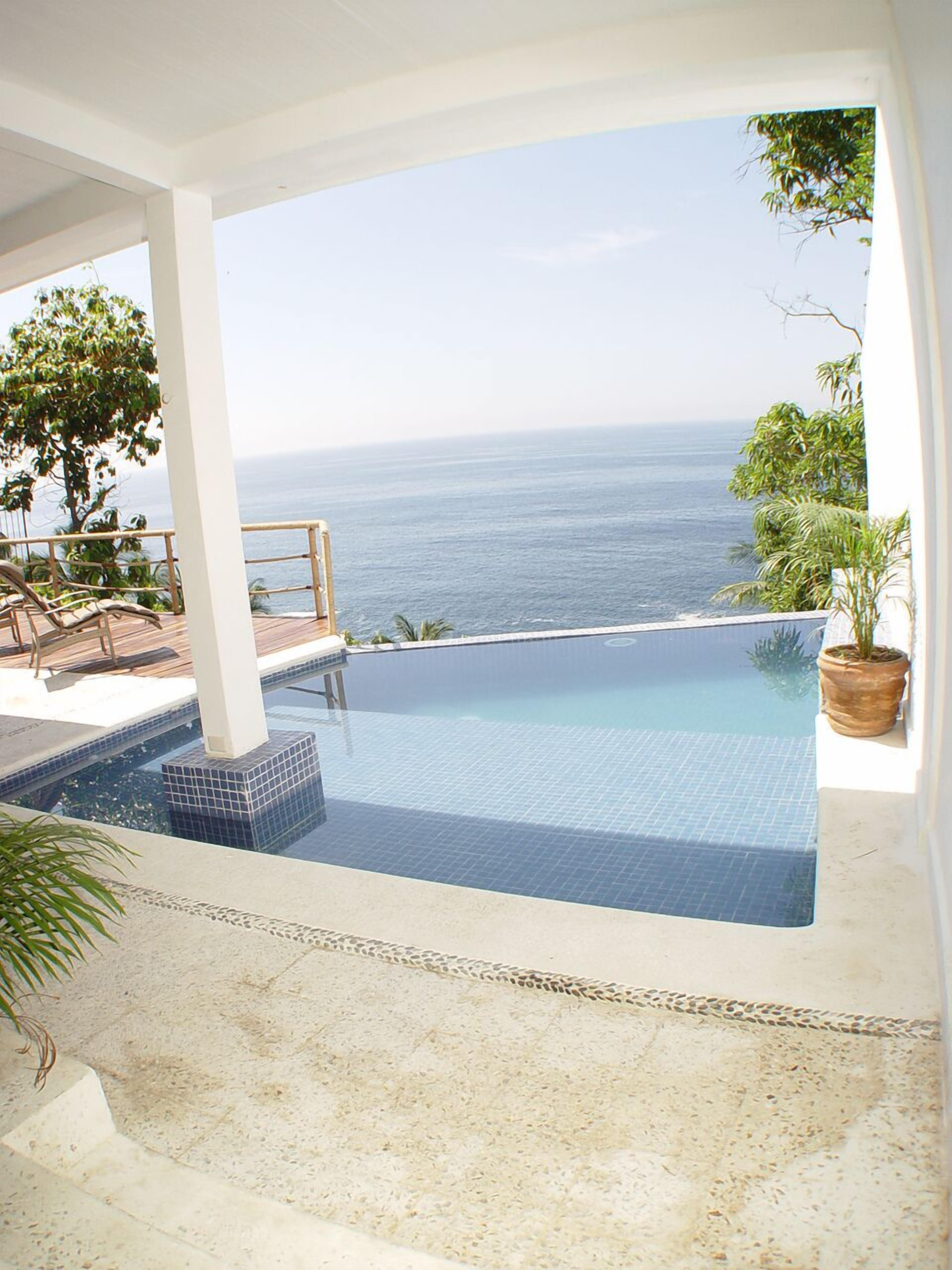 Suite with queen size bed, access to a lovely pool and a majestic oceanfront cabin on a quiet beach.