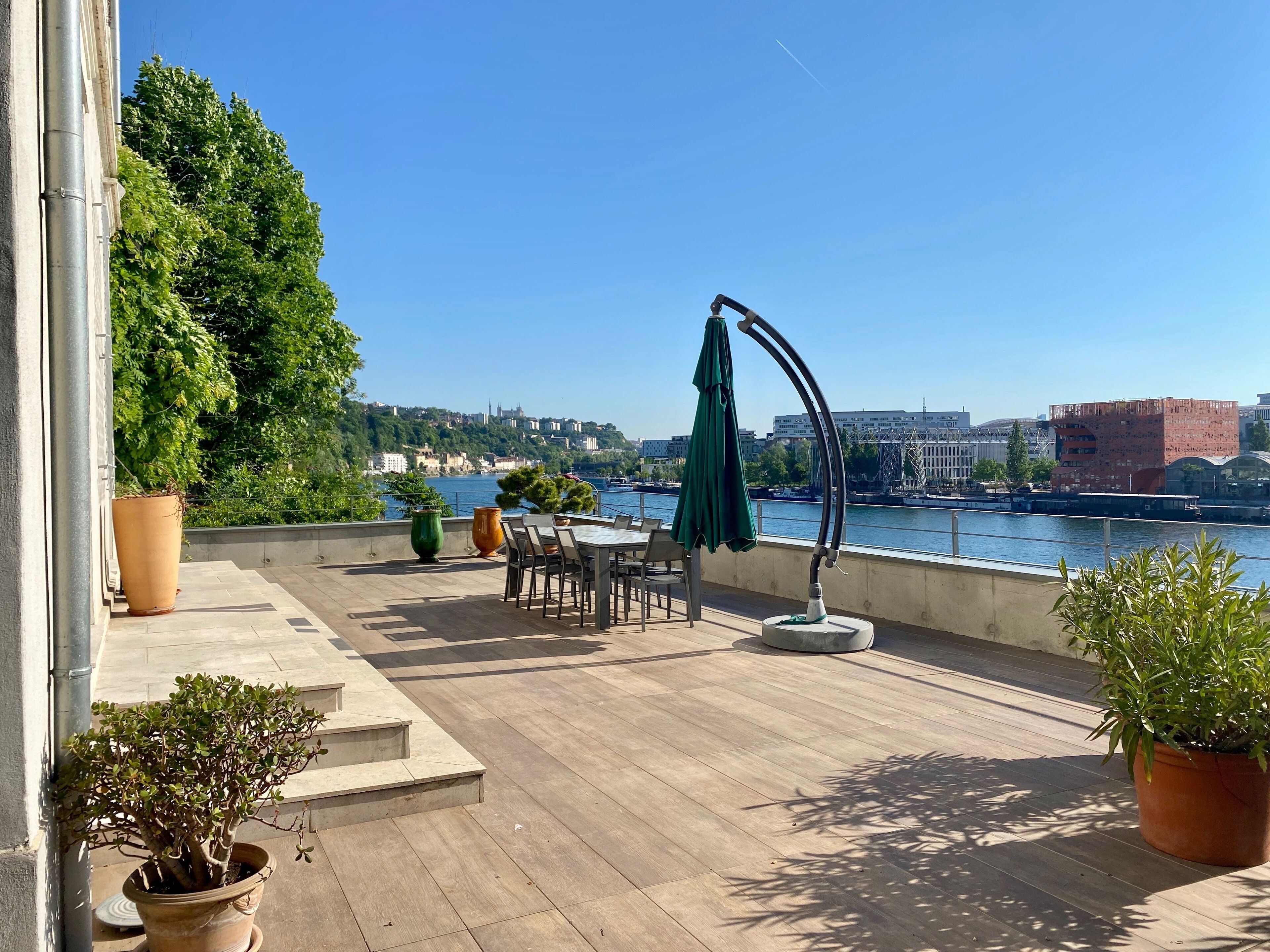Bed & Breakfast in a character house on the Quai de Saône, facing the new Confluence district. Beautiful terrace overlooking the river and the entrance to the city. Small terrace in lush greenery behind the house.