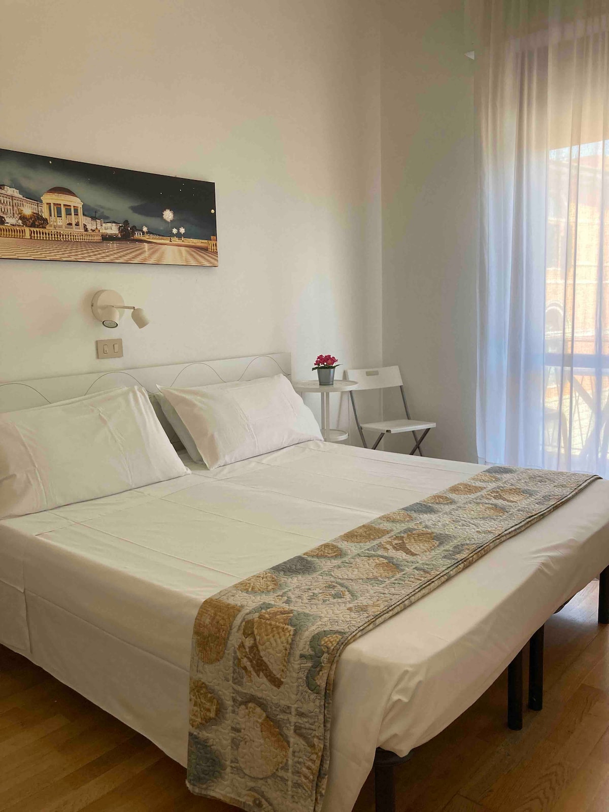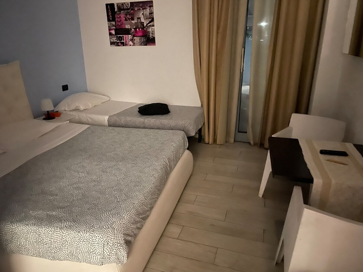 Hotel room with double bed and a single bed in Pisa city centre.