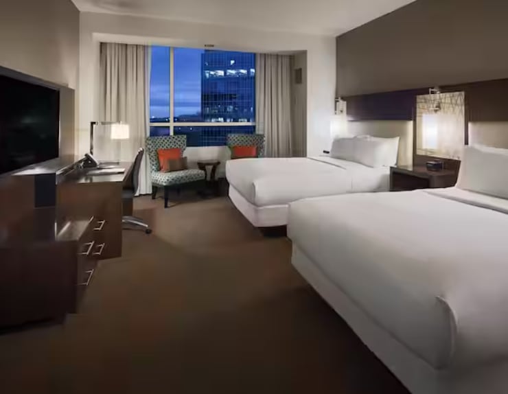 Hilton Dallas/Plano Granite Park offers 299 air-conditioned accommodations with laptop-compatible safes and safes. Pillowtop beds feature premium bedding. Refrigerators, microwaves, and coffee/tea makers are provided. Bathrooms include complimentary toiletries and hair dryers.