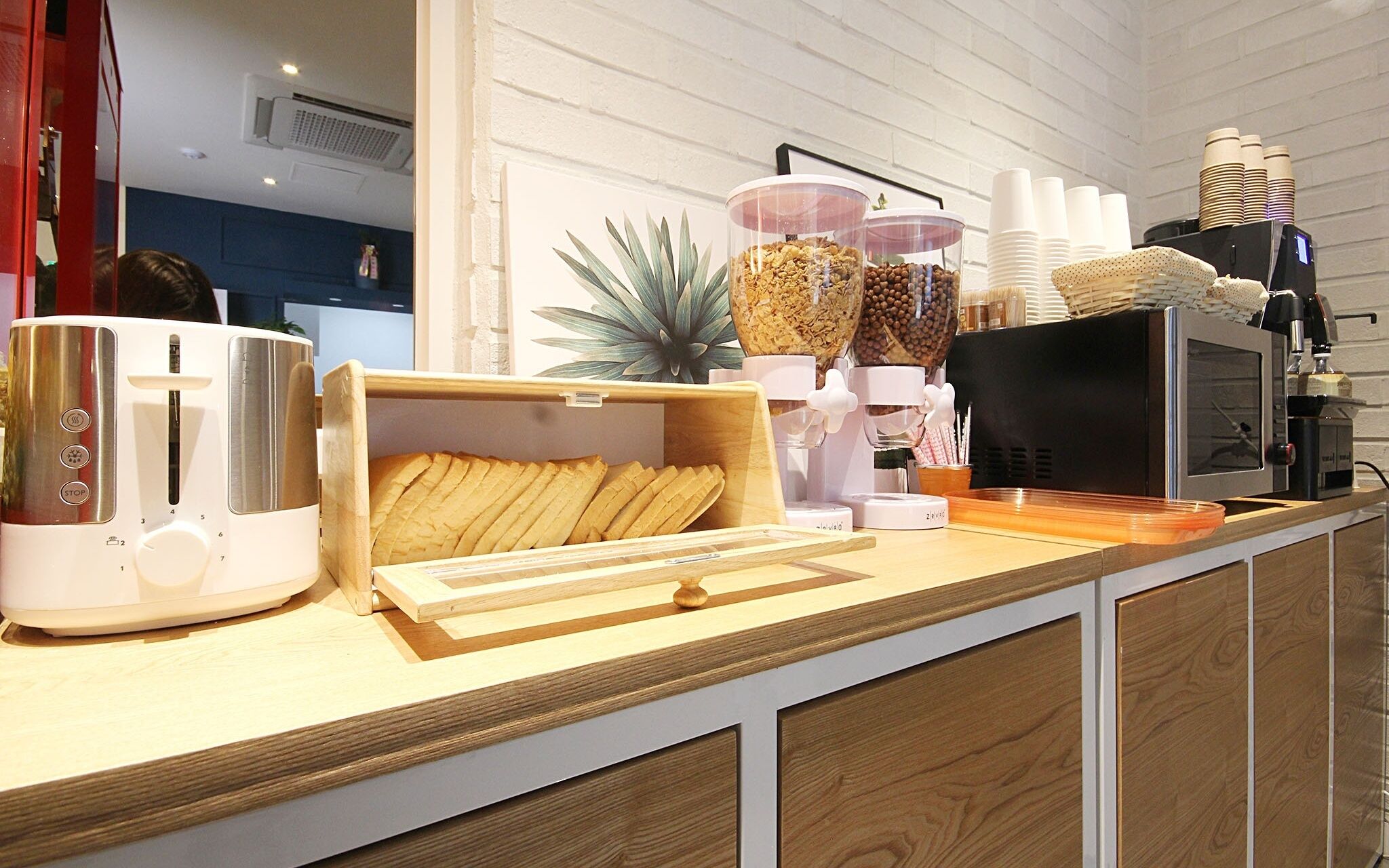 Free breakfast service is available (toast, cereal, milk, ramen)