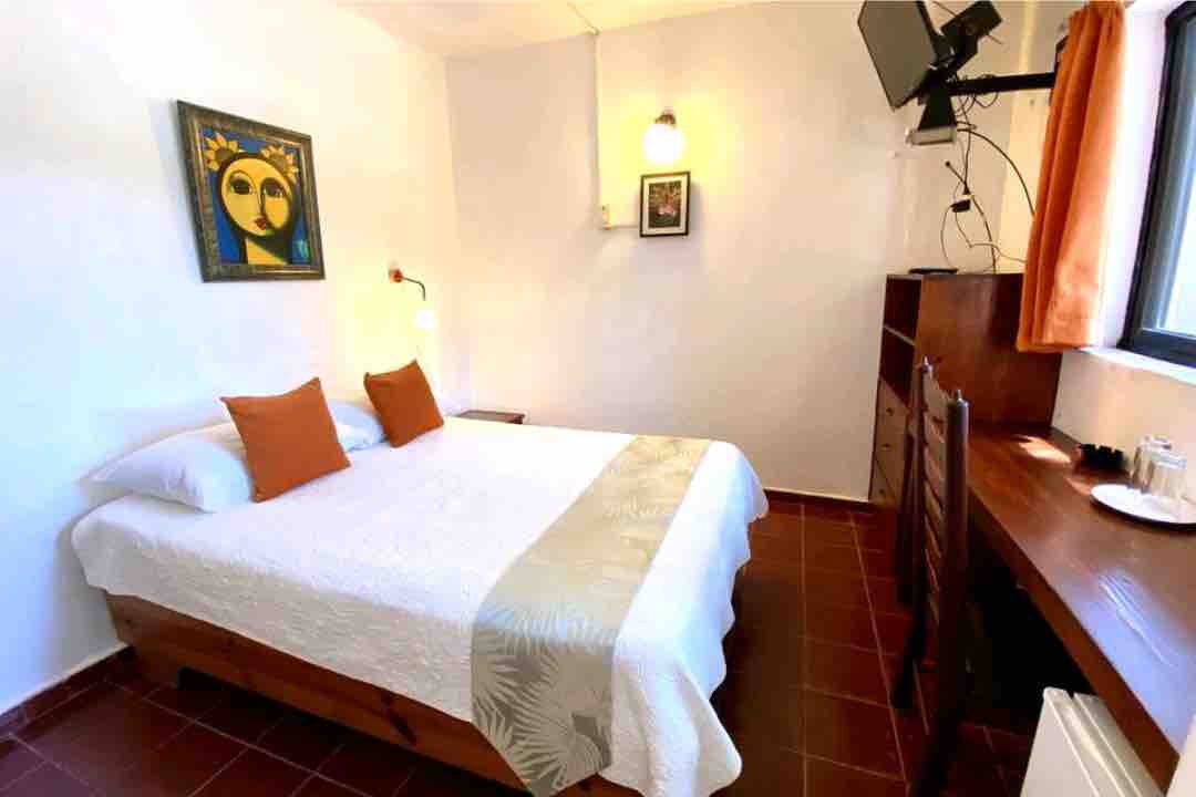 This boutique hotel features a nice tranquil atmosphere. The Yellow Plumeria room offers a large queen size bed, work desk with chair and fridge. Private washroom.