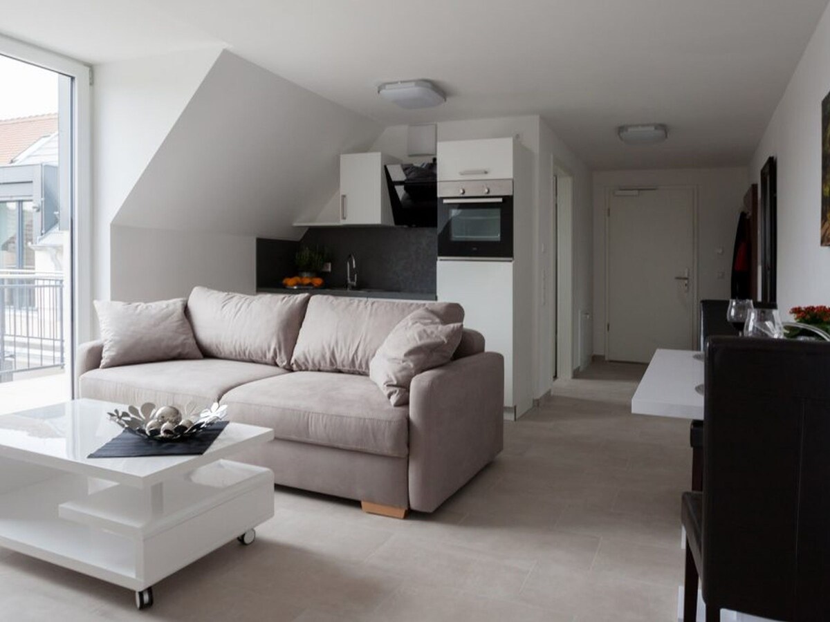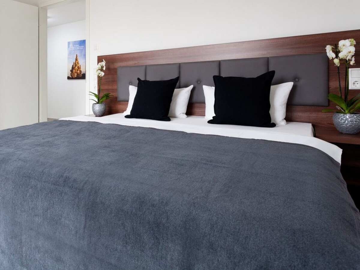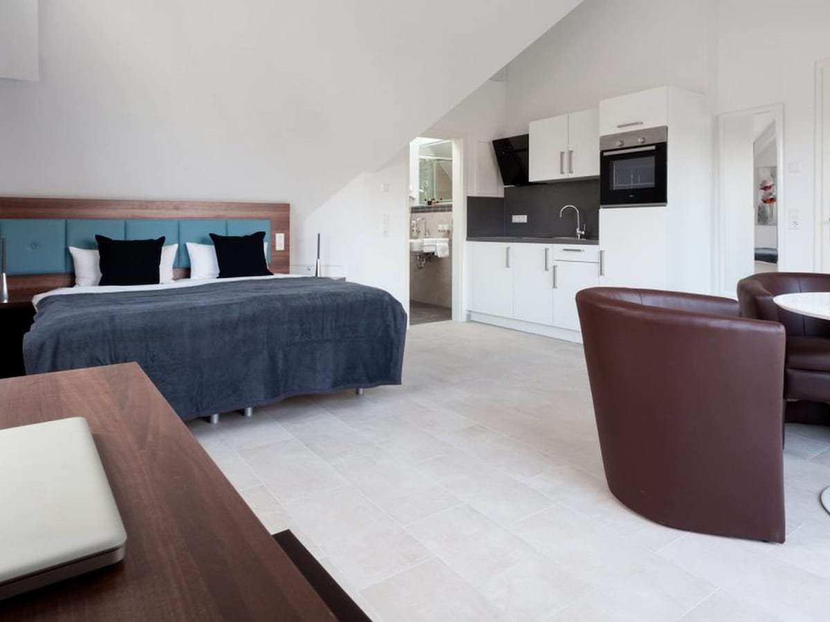Our 6 suites, which we also lovingly call a "business"suite, are between 50-62 square meters, have a separate bedroom, a living and dining area with dining areas, a fully equipped modern kitchen, a sofa bed, a spacious bathroom and a large balcony. The suites are standard equipped with insable lighting systems, LAN/Wi-Fi/TV and telephone.