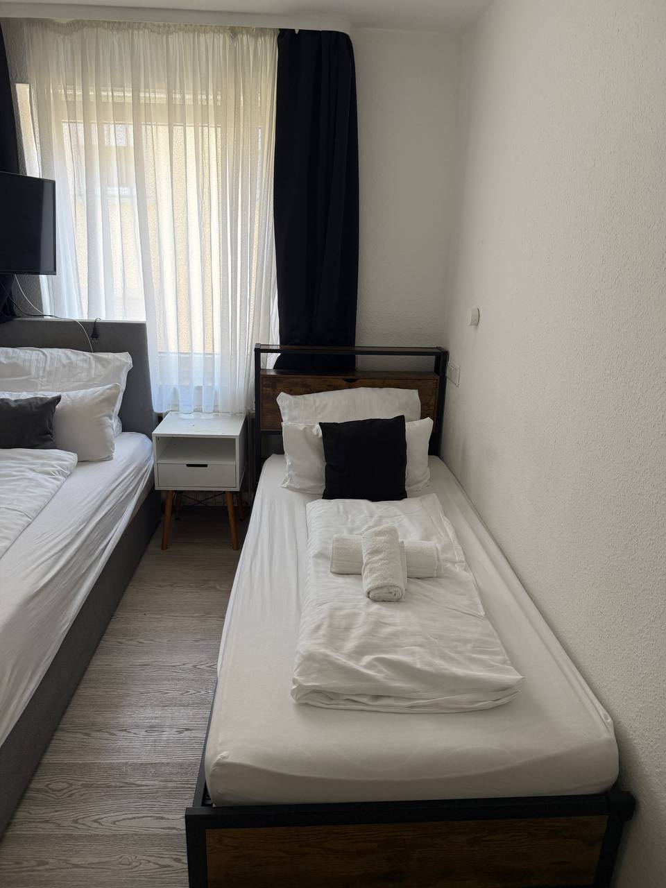 In the Hotel Schiff, this beautiful, bright, modern double room with two single box-spring beds awaits you, which can also be put together, and with the topper, it turns into a beautiful double bed without this annoying bed.