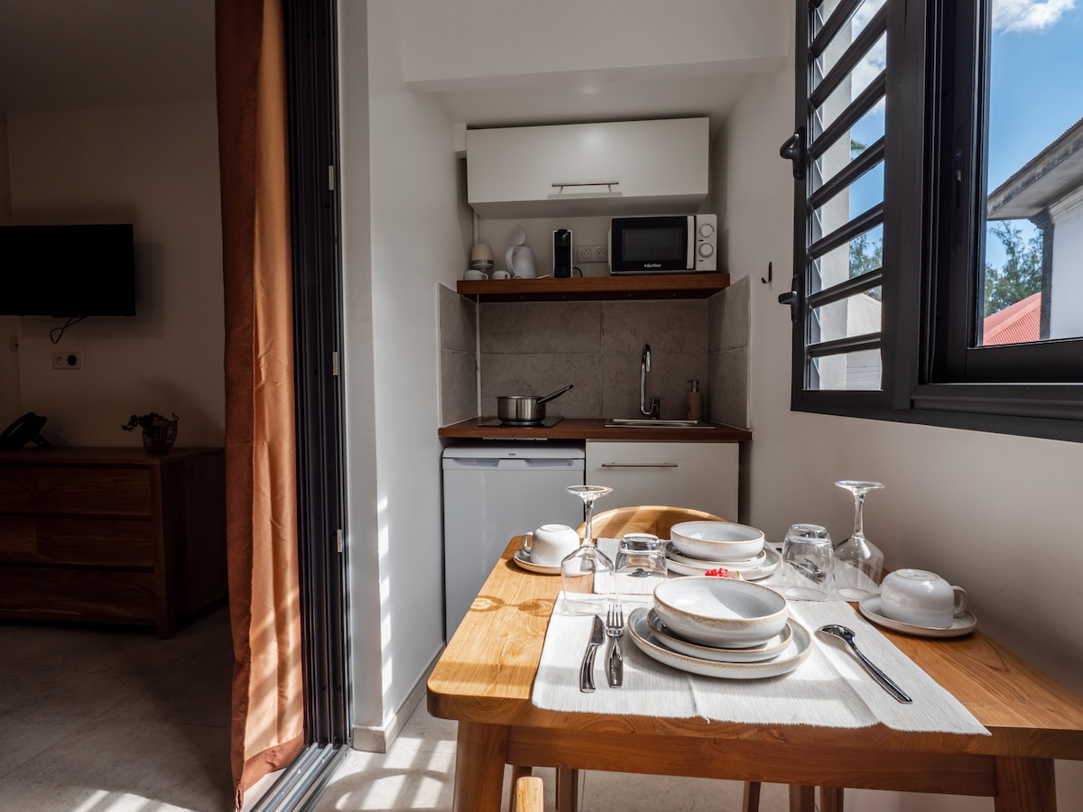 Discover "Filaos", a charming 20 m² studio that captures the essence of Reunion Island, located in the L'Escale Bleue residence in the heart of Saint-Leu. This accommodation is perfectly suited for couples or solo travelers looking to enjoy modern privacy and comfort while being just steps from the beach.