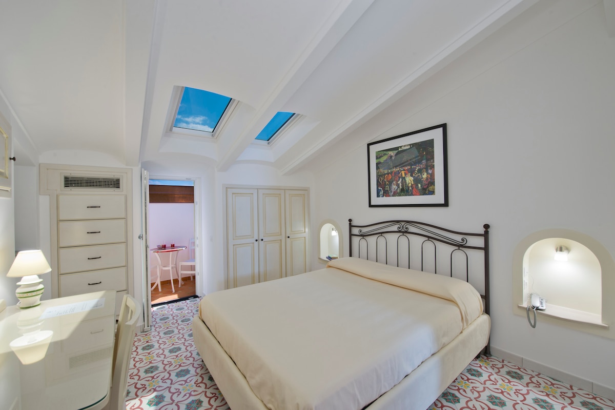 This bright bedroom features large skylights that allow the sun to shine in and illuminate the colorful hand-painted ceramic tiles from Vietri sul Mare. This room has a special atmosphere that is typical of the Amalfi Coast and is a great choice for a couple looking for a romantic stay.
